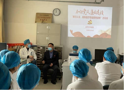血液内科党支部副书记、护理单元护士长张业玲发言,强调了耗材使用的风险防控点和护理在拒收红包方面的宣教工作。血液内科主任王伟就合理用药、外购药品备案制、第三方检查的原则等方面做了全面强调,严禁违反医院规定的诊疗行为发生。大家纷纷表示,在欲望和利益面前切不可淡漠法制观念,在权力和金钱面前不可丧失原则,迷失自我,严格自律,廉洁从医。