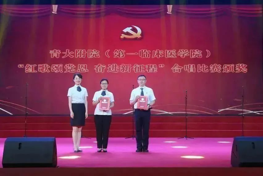 青大附院院长助理王琛,平度院区党委副书记、院长孟冬梅为合唱比赛三等奖获奖队伍代表颁奖。